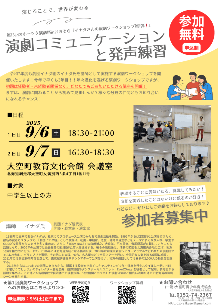 ★第13回オホーツク演劇祭inおおぞら『イナダさんの演劇ワークショップ第1弾❗』開催