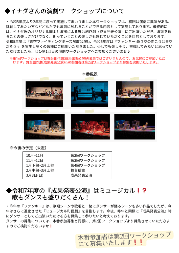 令和7年度も劇団イナダ組のイナダ氏を講師として実施する演劇ワークショップを開催いたします!今年で早くも3年目‼年々進化を遂げる演劇ワークショップですが、初回は経験者・未経験者関係なく、どなたでもご参加いただける講座を開催!!まずは、演劇に関わることから初めて見ませんか?様々な分野の仲間ともお知り合いになれるチャンス!