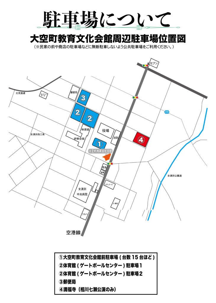 ・ホール駐車場は15台のみとなりますので、ゲートボールセンター(図②)または郵便局前駐車場(図③)をご利用ください。