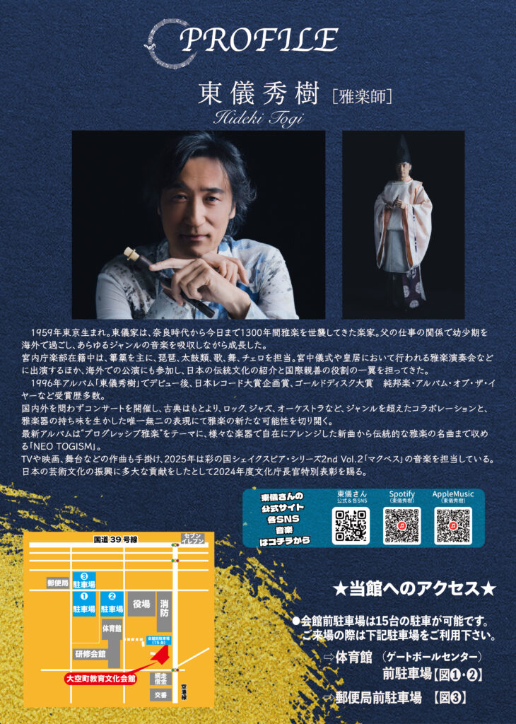 奈良時代から今日まで1300年間雅楽を世襲してきた楽家である東儀秀樹氏のトーク&ライブを大空町にて上演!宮中儀式や皇居において行われる雅楽演奏会や海外での公演にも出演し、日本の伝統文化の紹介と国際親善の役割の一翼を担ってこられた方です。幼少期を海外で過ごし、あらゆるジャンルの音楽を吸収し、古典はもとより、ロック、ジャズ、オーケストラなどジャンルを超えたコラボレーションと、雅楽器の持ち味を生かした、唯一無二の舞台をぜひ大空町で♪